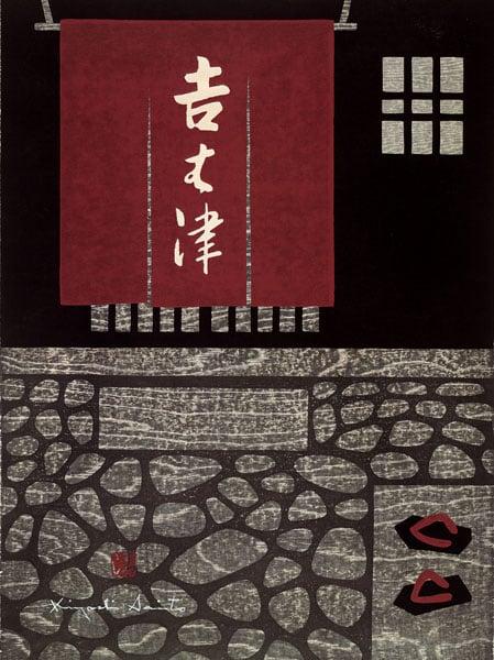 Saito Kiyoshi was a leading figure in the 'creative print' (sosaku hanga) movement in Japan, working in the colour woodblock medium that has been at the core of the country's great printmaking tradition. Early recognition at the Sao Paulo Biennale in 1951 led to an invitation to visit the USA in 1956, which consolidated his international reputation. Having specialized early in his career in snow views of his native Aizu, Saito switched in the 1950s to using the ancient imperial capital of Kyoto as his main subject. In this print, a dyed entrance curtain discreetly shields the lattice door of what may be a geisha house in the old Gion entertainment quarter, the large polished stones set in the pavement picked out in bold textured woodblock.