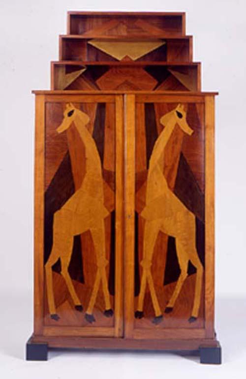 Omega workshop 'Giraffe' cupboard. The cupboard is fitted with two doors and a pediment on three shelves, decorated with a marquetry design of two giraffes against a geometric background. Designed by Roger Fry who conceived and ran Omega from 1931-21, a workshop for avant garde furniture etc.
