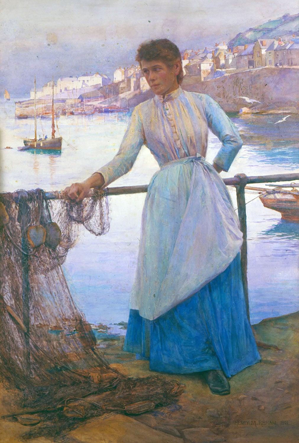 This work, besides being one of the best known and loved works by Henry Meynell Rheam, is also an outstanding example of his early style. While the majority of RheamÂ’s later paintings exhibit romantic, late Pre-Raphaelite leanings, and tend to describe classical Romantic subjects, this work, produced shortly after the artistÂ’s arrival in Newlyn and influenced by his concomitant immersion in the villageÂ’s artistic community, is strikingly grounded. The painting adheres to the rural realist style favoured by the Newlyn School, depicting a known local model, Effie James, against a background rich in sociological detail; the nets, floats and fishing boats central to local industry are all painstakingly captured and made to work in combination with the decorative beauty that characterises RheamÂ’s later imagined romantic subjects.