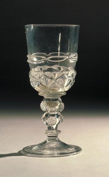 An early English goblet with a James II four pence piece from 1687 enclosed in the stem. The bowl and stem are proportioned in a common Bohemian type of circa 1700, which is usually faceted and engraved.