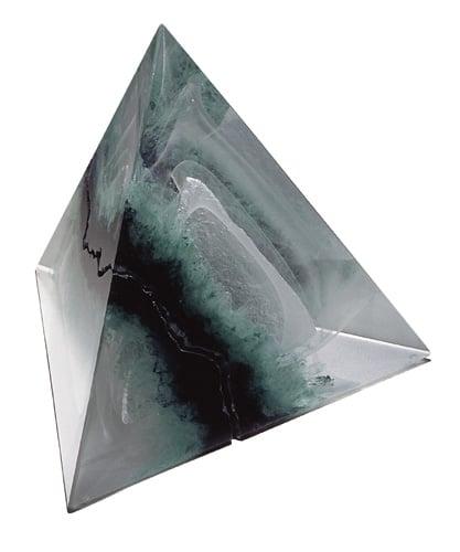 A green glass pyramid, made of two pieces, with a deliberately smooth and polished exterior, and cracked and splintery edges.