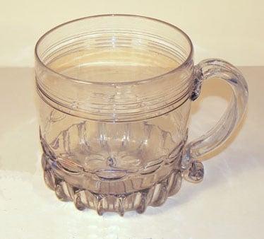 Glass tankard, with gadrooned base, a bowl decorated with chain pattern & applied trailing, and a strapwork handle.