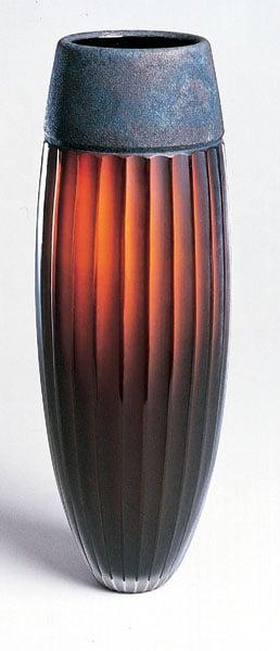 Tall, brown glass vase with deep vertical grooves leading to a patinated copper collar around the rim of the vase.
