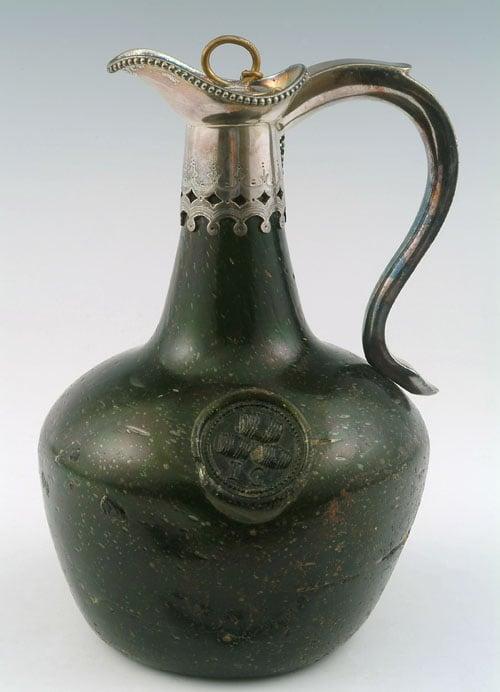 A green glass wine bottle, bearing a seal of three tuns and the letters I.C. below. A spout and a silver handle (not hall-marked) added in 18th century. Records show that there was a public house called the Three Tuns in St Paul's Churchyard.