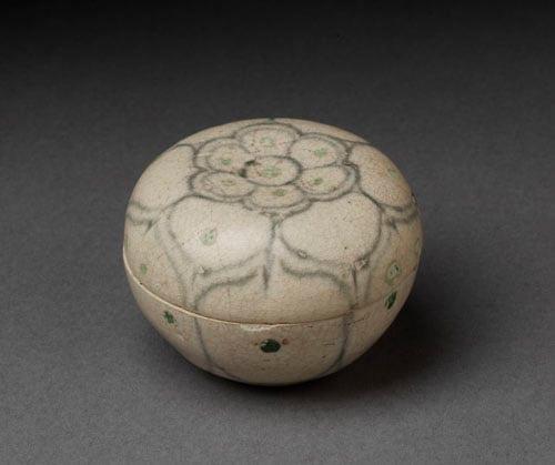Globular box and cover painted grey blue. An early example of enamel painting. Probably Annamese.
