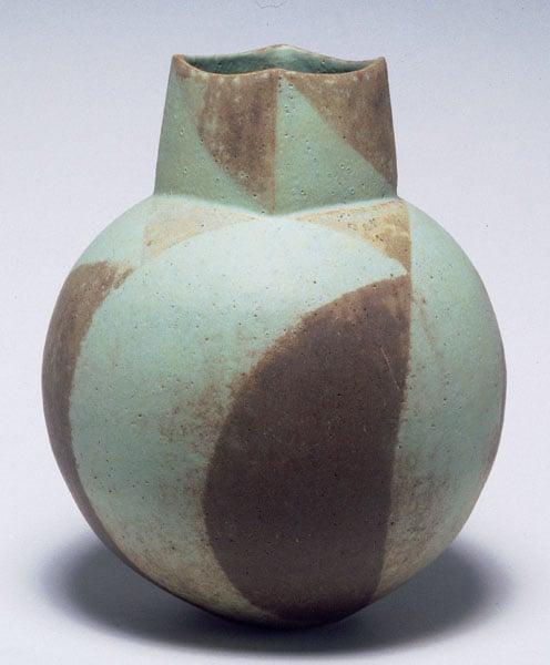 One of the artist's characteristic designs, a happy combination of brown geometric shapes on a green glaze.