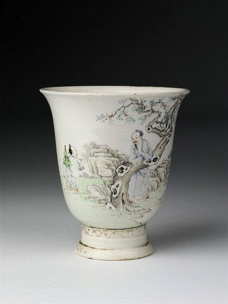 A goblet of 'soft paste' porcelain. Chinese;second half of the eighteenth century. Bell-shaped with short cylindrical stem. Painted and gilded. Scene: an old man and boy by tree.