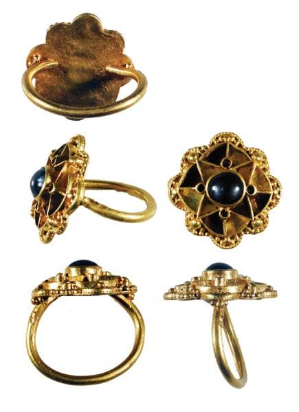 This gold finger-ring is set with a large central sapphire surrounded by triangular red glass inlays and embellished around the exterior edge of the bezel with fine gold and beaded wiring. The ring offers the potential of gaining a deeper insight into the history of the city of York and the surrounding region. The form of the ring suggests it may be from the seventh or eighth centuries. However, the presence of a sapphire would be unique if this were the date of production for the ring. The sapphire could mean the ring was made, or adapted later, maybe in the tenth or eleventh centuries. Such a combination of possible dates for the production and adaptation of the ring places it amongst a small set of rare and intriguing high status objects in York that allude to Viking tastes for cherishing and 'improving' art objects of earlier periods. It is possible that this work was undertaken in York itself.