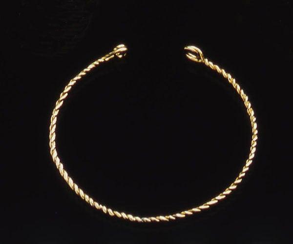 This torc is made from a single strand of gold wire about 2 mm in thickness and originally about 3 feet long. This strand was doubled back on itself to give the appearance of a double strand, and it was then twisted rope fashion. The two ends were left untwisted and fashioned into double loops about a third of an inch in diameter. The single joint can be discerned about midway along the twisted section. The final stage consisted of bending the ornament into penannular form for use as a neck ornament.