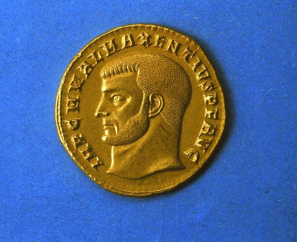 Obverse of medallion in high relief carries rather stark but effective bare-headed and naturalistic portrait of Emperor. On reverse, in lower relief, the Emperor appears in guise of Mars.