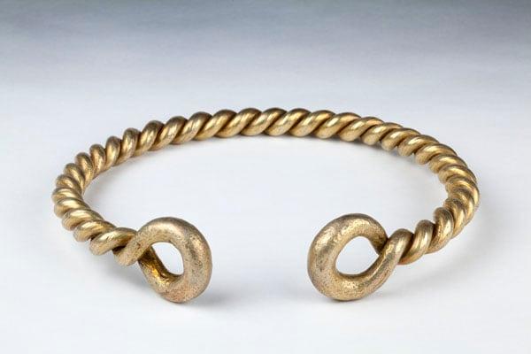 Early Iron Age torc or necklet made of two metal rods twisted together. Found in a field at Bawsey, near King's Lynn. Weight: 33 ounces, gold 45 %. Diameter 8 inches.