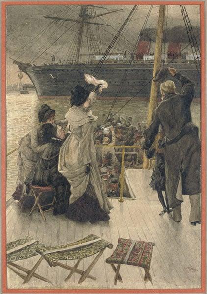 The scene shows a family at sunrise on a ‘tender’ or ferry. They are waving to friends or relatives leaving for New York onboard a trans-Atlantic Cunard liner. In 1880 Liverpool was still Cunard’s principal port for North Atlantic passenger travel. The company did not send ships to New York out of London until about 1910. The bearded mariner wearing a cap, in the centre of this work, is based on Captain Freebody. It may have been through Freebody that Tissot visited Liverpool by steamer and saw the city from the Mersey estuary, as depicted in this watercolour. This work adds to the National Museums Liverpool's growing collection of views of Liverpool which includes Ben Johnson's Liverpool Cityscape archive also acquired with an Art Fund grant in 2010.