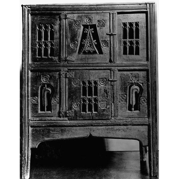 Livery cupboard of oak out of which food was handed (livree). Open-work panels of perpendicular Gothic with the letter A and two single ostrich feathers.Formely owned by Arthur, Prince of Wales, eldest son of Henry VII. Found in a Shropshire farmhouse.