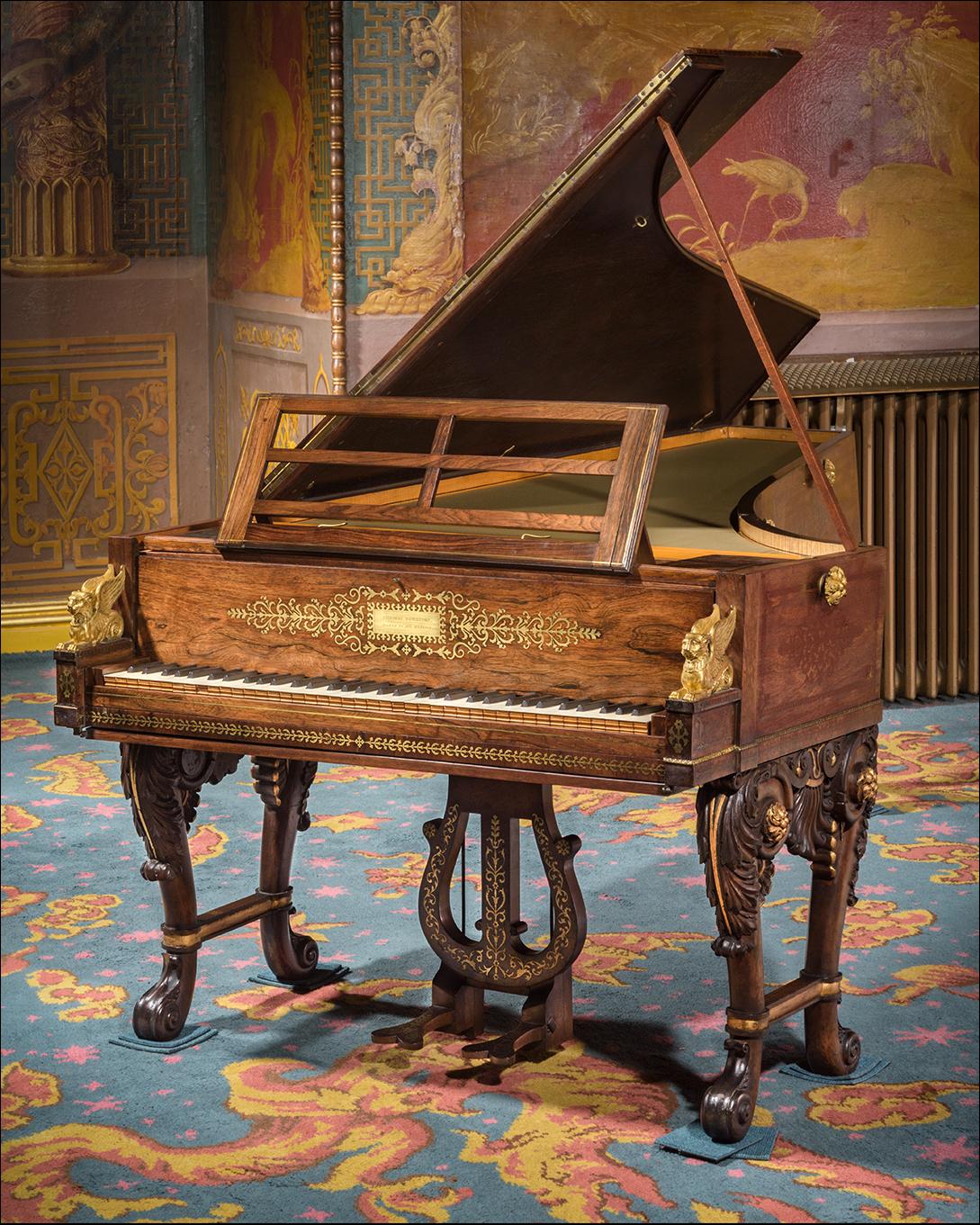 This extravagantly decorated piano was commissioned by George IV and made for the entrance hall of the Royal Pavilion, Brighton. Thomas Tomkison was the foremost piano maker of the age, producing instruments for the Prussian court as well as for the British royal family.