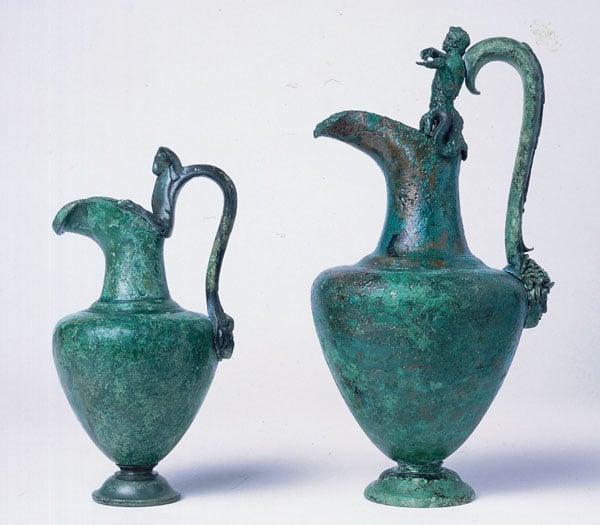 Approximately 150 objects from two adjacent cremation burials, the larger of a man and the smaller of a female relative (suggested by the sharing of 'sets' of bronze). Includes pair of penannular silver brooches and linking chain; two cast bronze wine jugs; a further 12 bronze vessels including dishes, bowls, flagons, patellae, lamp and 'wine strainer'; 10 glass vessels; 14 Samian Ware pottery bowls and dishes; lion-headed studs and rings from a casket; and 35 iron/steel arrowheads. The burials illustrate the luxury of possessions of what is thought to have been a family of client aristocrats, perhaps living in a villa at Wheathampstead.