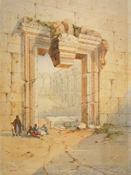 Catalogued as 'The Doorway, Baalbec' signed and dated 1856. Part of a collection of 36 drawings of the British School distributed to 20 museums.
