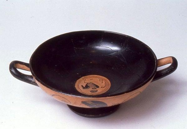 Outside of cup decorated on one side with a bust of Dionysus and on the other with that of Ariadne. On inside is small medallion of Pegasus. Cup part of compact not large group of vases decorated with head and shoulders.