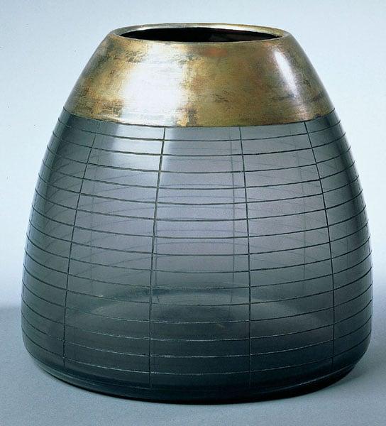 This vase shows how the artist evolved and developed the technique of electroplating. The 'beehive'-shaped grey cut vase reflects her desire to make a vessel that had solidity in form and energy; the glass not being blown too heavily as the shape should have weight. It is a substantial piece, weighing almost five kilograms. Deep wheel cuts made the concentric circles and vertical ribs that decorate the piece, and the rim is electroplated in brass.