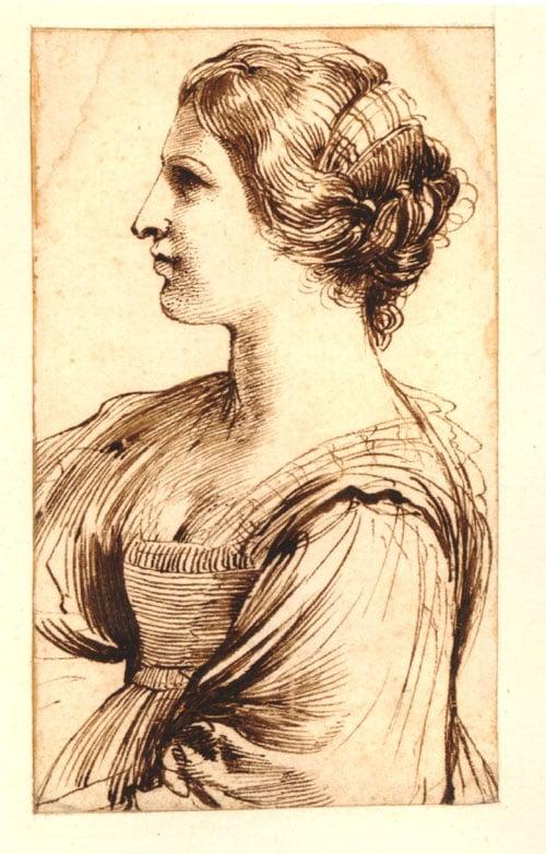 A woman in profile to left, half-length. Part of an album of drawings belonging to Lord James Cavendish MP (d 1741), son of the second Duke of Devonshire (1665-1729), founder of the great collection of drawings at Chatsworth. The collection of drawings form an interesting relic of the great age of collecting in England.