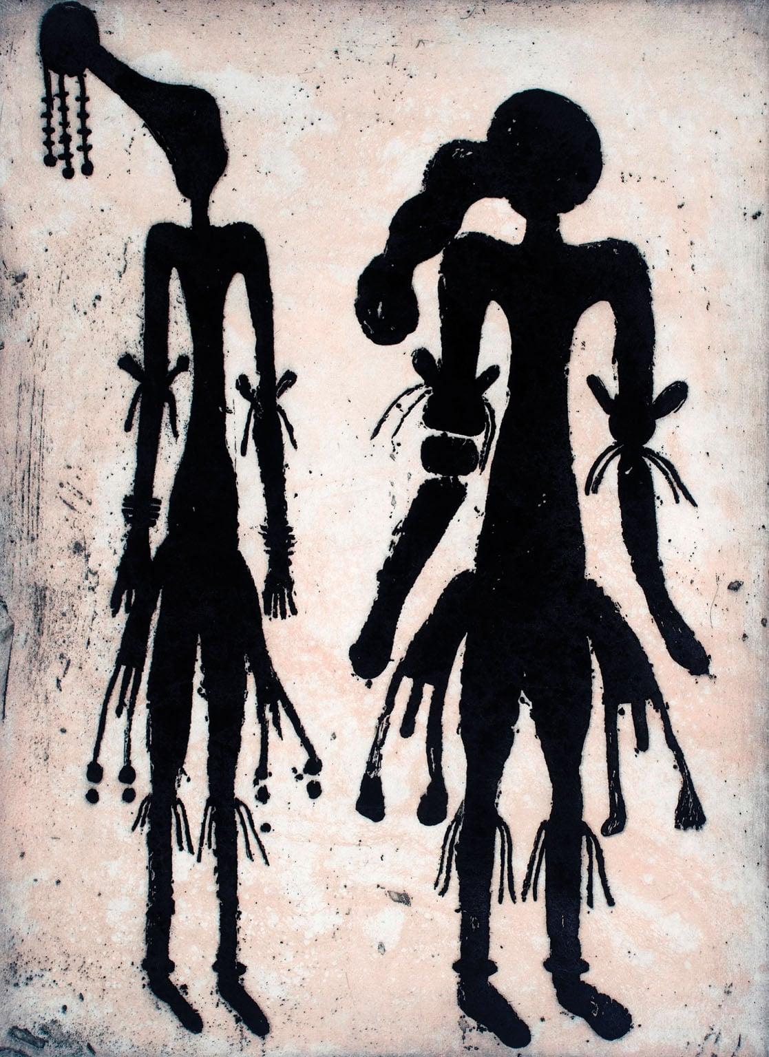 Regina Karadada is a member of an important family of artists of the far northern Kimberley region, renowned for their paintings of Wandjina figures, a distinctive genre with great round faces, surrounded by a kind of halo, famous in the rock art of the area. Her work is distinctive in that although it is similarly inspired by rock art, she presents images of a different kind, known as guion guion, commonly elongated figures that seem to bear elaborate head-dresses or wigs, and that carry ornaments, sticks, bags or weapons. These figures, known also as Bradshaws (after one of the locations in which they were studied by archaeologists) have been enormously controversial among archaeologists and ethnographers of Aboriginal art, some having argued that they are so stylistically distinctive that they must have been created by a distinctive, prehistoric, non-Aboriginal population. Though this view is not widely accepted today, it exemplifies longstanding arguments about rock arts that were formerly considered 'too sophisticated' to have been produced by the indigenous populations. Karadada's family and community are remote from the cities and institutions in which these debates took place; there is no issue for her; the imagery, though millenia old, is part of the living ancestral tradition of her people. This acquisition was presented by the Art Fund and the Esmée Fairbairn Foundation