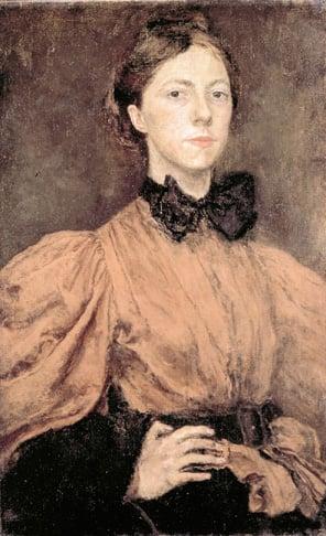 In this narrow half-length portrait, the subject is posed slightly to the right, her right hand resting on the belt of her black skirt. Her dark-grey eyes look at the spectator. She has brown hair dressed up from the neck, arched eyebrows, and a rather pale complexion. Her light-brown blouse with broad sleeves has a black ribbon at the throat, while some black material is draped over her right forearm.