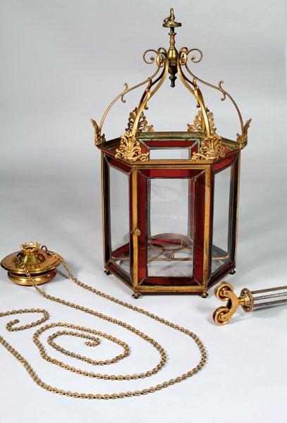 The lantern has fine neo-Classical ornament and is remarkable for the survival of its ruby glass borders in the six main panels. It also retains its chain and pulley mechanism, allowing for its height to be adjusted when a lamp or candle is required to be placed inside.