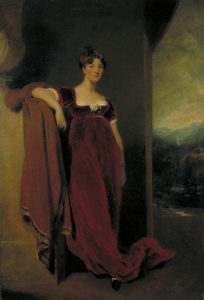 In this full-length portrait, the Countess Harriet Anne Butler is painted in a red dress, leaning against a pedestal on which a brown cloak is draped. Through an open doorway a stream winds its way down from distant, blue mountains through a wooded landscape.