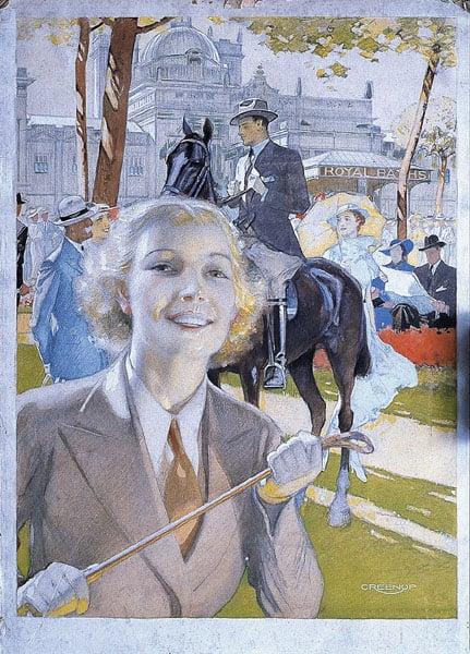 Street scene with female holding a riding whip in the foreground and the Royal Baths in background.