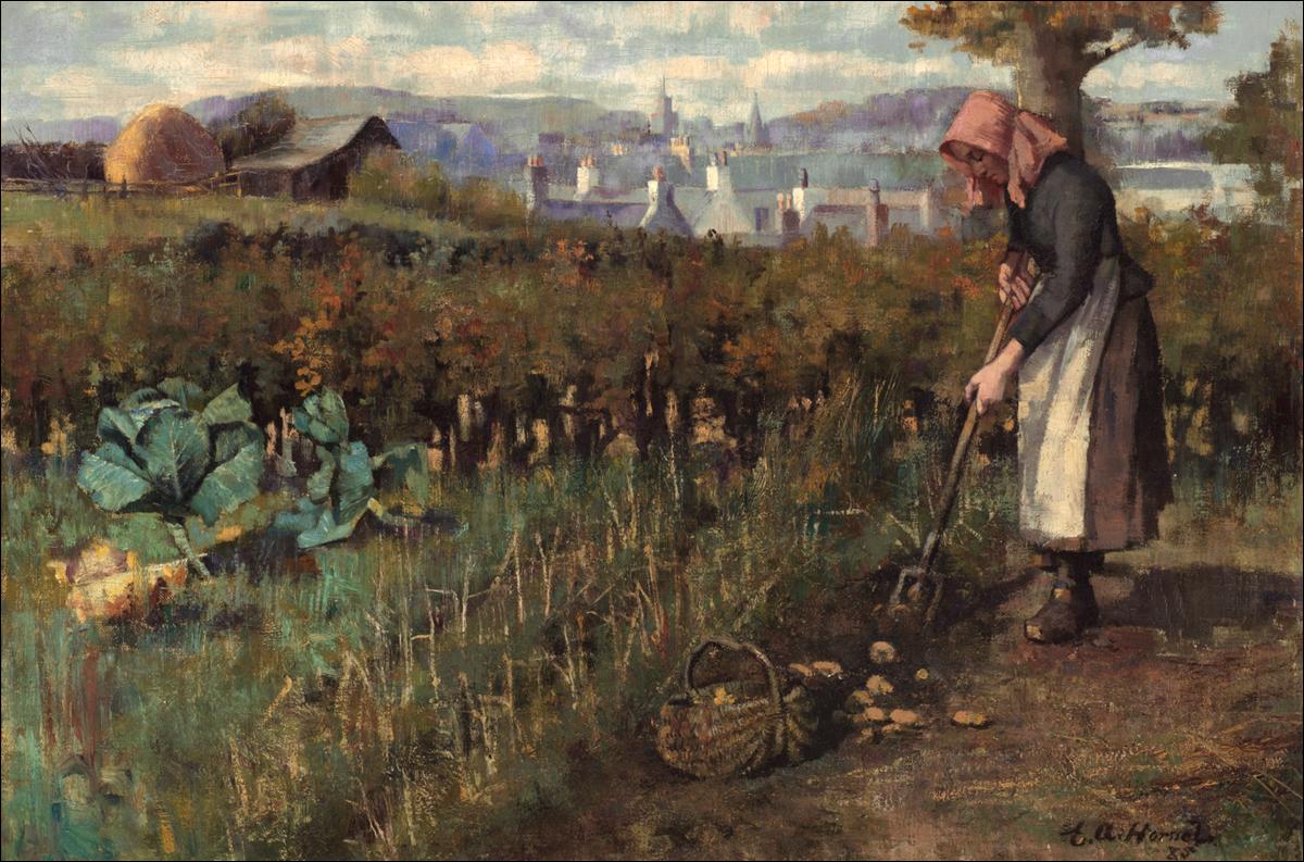 Edward Atkinson Hornel was a member of the Glasgow Boys circle of Scottish painters. He trained at Edinburgh School of Art and in Antwerp, where he became interested in painting naturalistic scenes of everyday life. Harvesting, Kirkcudbright, painted when Hornel was just 21, shows a woman digging potatoes with the rooftops of Kirkcudbright in the distance. Hornel grew up in Kirkcudbright and continued to live in the town until his death in 1933. In 1901 he bought Broughton House and added an impressive gallery in which to show his paintings. The house, owned by the National Trust for Scotland, is now a museum dedicated to the artistÂ’s life and work and this early painting makes an important addition to the collection.