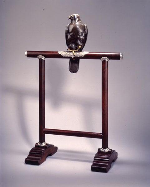This is a shibuichi hawk which has been hammered and engraved and then inlaid with shakudo, gold and silver. Birds were a favourite theme in Meiji period sculpture where the virtuosity of technique was a main feature. It may have been made for one of the International Expositions where Japan sought to demonstrate the skill of its craftsmen to the west. The stand is contemporary with the sculpture and probably associated with it.