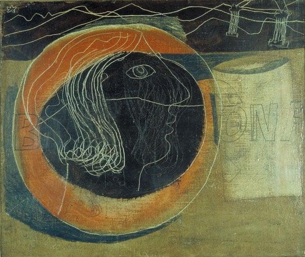 Your can see an outline profile of a head to the left of this painting, and to the right, a mug with the lettering 'B' and 'ONA'. Lines of hills and a classical building can be seen in the background with a star sitting above it all.