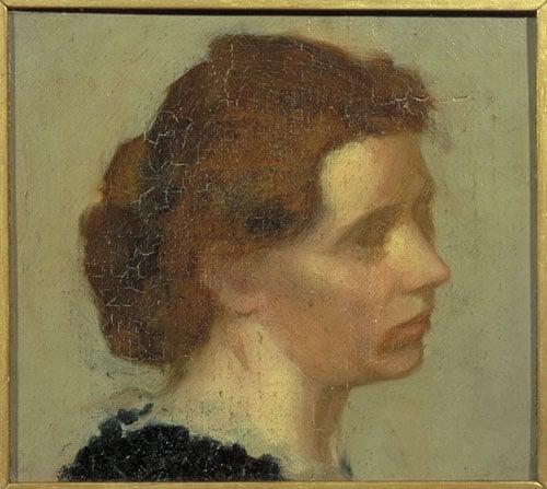 A woman's head, almost in profile, faces right. Of sallow complexion, she has dark-brown hair and wears a black dress, against a grey background. One of twenty seven gifts to seven museums by A E Anderson through the Art Fund between 1922 and 1938. On loan from Tate.