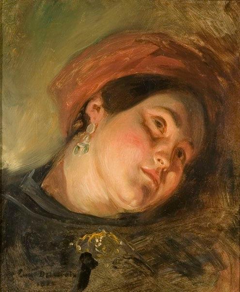 The sitter is shown in three-quarter profile, her head tilted back leaning over to her left as though reclining. Her dark hair shows beneath a light-red turban; she wears a turquoise earring and, below her throat, a gilt brooch on a dark grey or black gown.