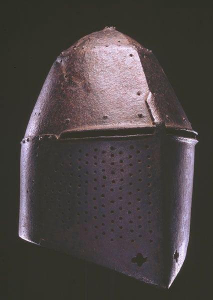 Would have been worn over a bascinet, with a crested cap held in place above it by laces passed through the pairs of holes in the conical skull-plate.