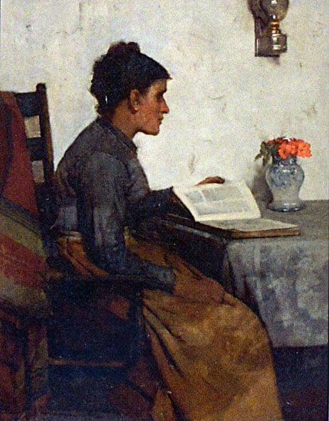Tayler was a leading member of the art movement known as the ‘Newlyn School’. This work was painted using the classic square brush technique, and represents a typical Newlyn interior, with a single female figure seated at a table, reading the Bible.