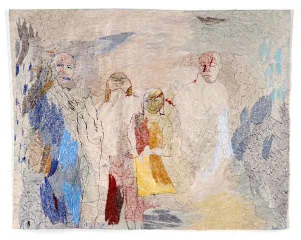 This work is a large-scale free machined embroidery. It demonstrates Kettle's bravura stitching technique, translating an impressionistic watercolour drawing into stitch, literally painting with machine needle and thread. The image is Kettle's reinterpretation of an Ethiopian cartoon on gesso seen at the Hali textile fair in Halifax. This work won first prize at the PFAFF Art Embroidery Challenge 2005, an international competition for embroidered art created entirely on a sewing machine.