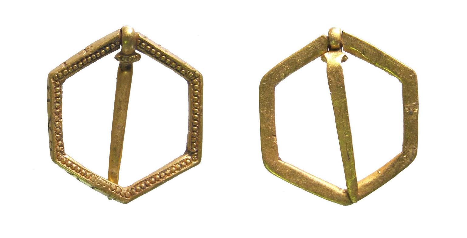 This diminutive medieval brooch was discovered near Lincoln in 2011. The hexagonal frame features a triangular cross-section bearing the inscription ‘+IO SVI CI EN LIV DAMI’ – ‘I am here in the place of a friend (I love)'.