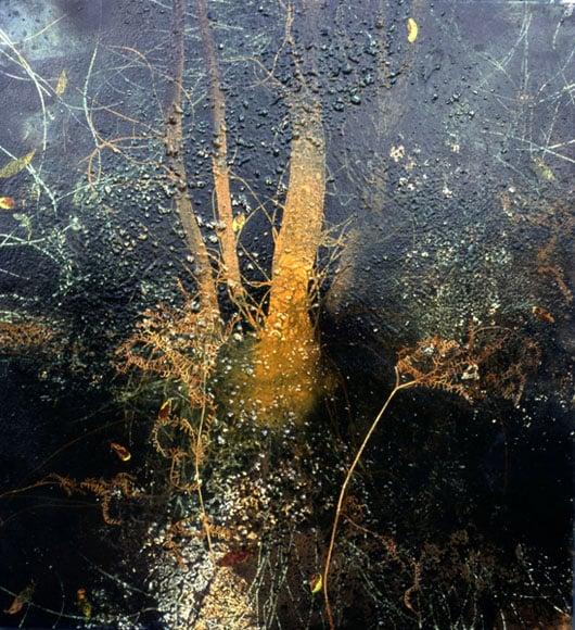 This is a retrospective study of Shining Cliff Woods in Ambergate, Derbyshire. Porter referred to old photographs of the Derbyshire Woods taken during his visits in the 1980s as can be seen in the bright limbs of the clump of trees. In some areas, the tree limbs fade into the dark, a result of PorterÂ’s constant re-working and layering of paint. The painting is significant to the Derby collection for its local geographical resonance, its bold contrasts of light and dark, and PorterÂ’s intense interest in the texture of the paint. The duality of light and dark, to reveal and simultaneously conceal is also a feature of the work of Joseph Wright of Derby. The museum hopes to explore the similarities between the two artists in greater depth.