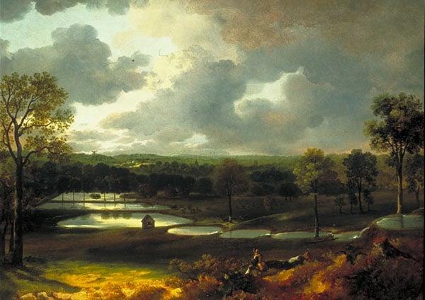 This is a panoramic view of Holywells Park Ipswich looking north-eastwards, showing the series of man-made ponds constructed by Thomas Cobbold from natural springs to provide pure water for his brewery. The careful depiction of the unusual formation of ponds in the foreground is characteristic of Gainsborough's style from 1748-50 and the dramatic treatment of the panorama with its atmospheric weather effects is strongly influenced by Dutch artists such as Ruisdael. Although Gainsborough lived in Ipswich for seven years, this rare early work is his only known depiction of the Suffolk town. This work was acquired with assistance from the Wolfson Foundation.