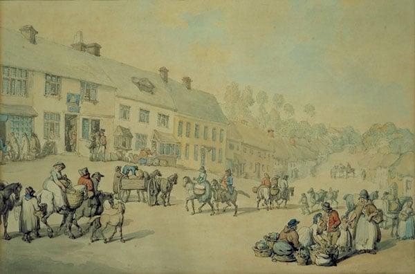 Depicts the High Street with the Bell Inn in the background. Street filled with groups of figures, mostly on horseback and laden with produce. Two market women at bottom right. Several soldiers stand outside the inn and people gaze into shop window next door.
