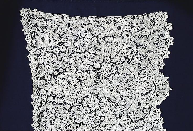 Mrs. C. Treadwin, an important 19th century Devon lace-maker, owned a small business in Exeter repairing and producing new designs of lace. The veil and flounce form a matching set illustrating the fashion of the period.