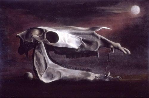 This painting is one of few surviving surrealist works by Peter Rose Pulham after his studio was hit by a German bomb in 1941. We have a fascinating insight into the circumstances surrounding the production of this painting from the diary of the cookery writer Theodora FitzGibbon, who shared a flat with the artist in the early years of the Second World War: 'Naturally he [Pulham] wanted to get as much painting done as possible before he was draftedÂ… and now had a desire to paint not human, but animal skulls. Â… Peter had decided that a sheepÂ’s head wasnÂ’t the right shape or size... What he envisioned was something like a horseÂ’s head, and he did rather keep on about itÂ… During the course of this Saturday afternoon we soaked, washed, scrubbed, even cleaned the teeth, which we found lifted in and out, of the noble skullÂ’. This was the Scottish National Gallery of Modern ArtÂ’s first acquisition of a work by Peter Rose Pulham, and represented a significant addition to one of the worldÂ’s great collections of Surrealist art.