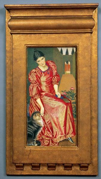 Hortus Inclusus means a private garden, typified here by the tall yew hedges in the background, and was a popular Renaissance theme. This work is a portrait of Southall's future wife, Anna Elizabeth Baker with her cat. It suggests the atmosphere of an idealised resting place apart from the world.