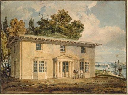 This is one of the artist's early works showing a small house with gabled portico and trees behind. In the distance is the estuary of a river with shipping, and three small figures can be seen.