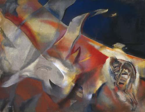 To the right, in the corner, is a small naked figure with bowed head, and above is a dark blue patch suggestive of a night sky. The left is occupied by an intricate design of white, red and yellow, vaguely suggestive of light and flame which seems to change in shape and to have a certain movement.