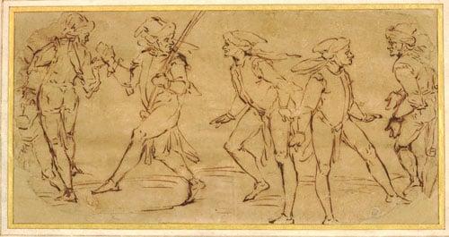 A group of 6 male figures running and gesticulating including one moving to the left holding a staff and looking over his shoulder. This drawing was attributed to Bernardo Strozzi when it was acquired. It is inscribed on the mount with 'Il Cappuccino Genoese'.