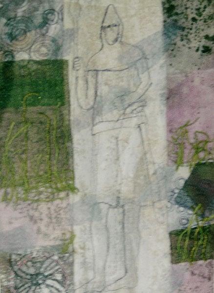 Two mixed media works inspired by the Kilmartin Glen area, incorporating motifs of prehistoric rock carvings, medieval grave slabs and carved crosses which remain in the landscape today. The muted tones capture the mood and colours of the glen.