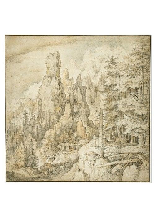 In the middle-distance is a high, curiously shaped rock. To the right is a knoll with bare and fallen pine trunks and a grove of pines beyond. There is a road with figures in the foreground to the left, leading to buildings and a mill stream.