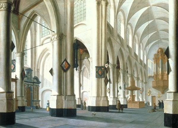 De Blieck painted two versions of this scene. Differences in the appearance of the church in the paintings and drawings verify that de Blieck altered his compositions freely. In this painting the nave has been lengthened by two columns, giving the interior an invented grandeur of breadth and width. The artist also added a pulpit at the middle columns to balance the view of the elongated nave.