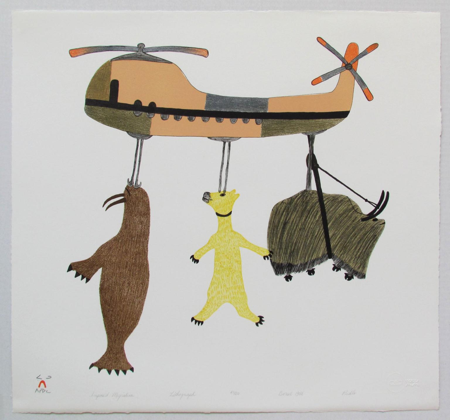 Pudlo was an important artist, the first (and to date, the only) Inuit artist to be given a retrospective at the National Gallery of Canada, in 1989. His 1976 lithograph, Aeroplane, was the first Inuit print to depict modern technologies, and it was later featured on a Canadian postage stamp. Pudlo returned to this theme on a number of occasions—and added helicopters, ships, power cables, and so forth. This is a strong and engaging example of this strand of his work, and invites comparison with the Papua New Guinean artist Kauage's helicopter and aeroplane imagery. This acquisition was presented by the Art Fund and the Esmée Fairbairn Foundation.
